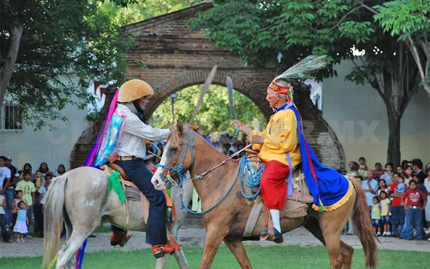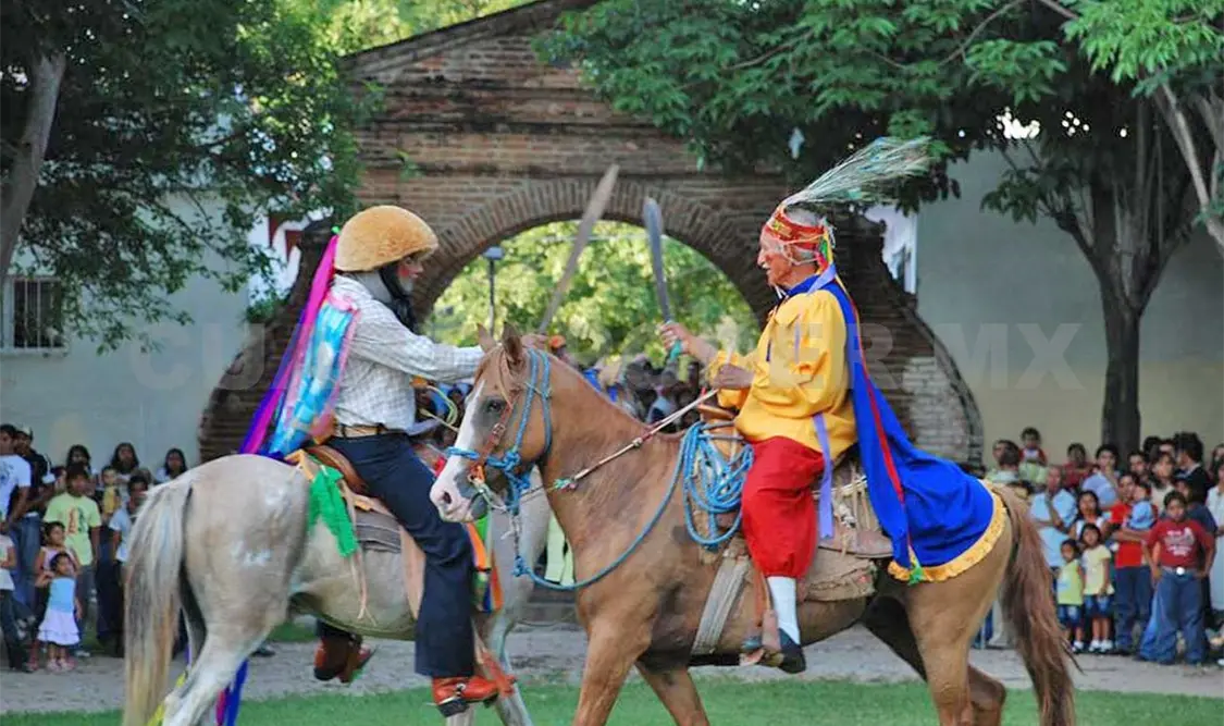 La definición de los Alférez y Naguarés, el primero, deviene del árabe Al-faris (el jinete), de Faras (caballo) y Naguaré del chiapaneca Na’guaré (textualmente: máscara o cara de madera), de Na (palo, madera, árbol) y Nguaré (cara, faz, rostro, etc.), es una escenificación, pero no una danza, que recrea la batalla de moros y cristianos. Esta escenificación ritual, simboliza las dos posiciones cenitales del sol, ocurrentes el 3 de mayo y el 9 de agosto, para esta latitud geográfica del hemisferio norte.
