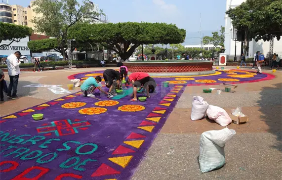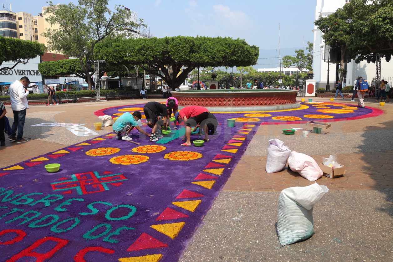 Para esta pieza de 58 metros se utilizaron cerca de cien costales de aserrín y su elaboración comenzó cerca de las tres de la mañana del pasado miércoles. A pesar de lo laborioso del proceso, el artesano lo define como una “bonita experiencia” que disfrutan realizar y compartir.