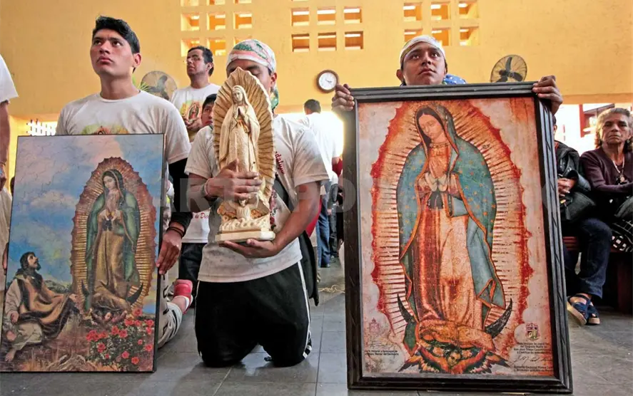 Hombres, mujeres, niños, niñas y ancianos avanzan con cánticos, banderas y retratos de la Virgen, emocionados por entrar a la parroquia, recibir la bendición del padre y corear “!Viva la Virgen de Guadalupe!”.