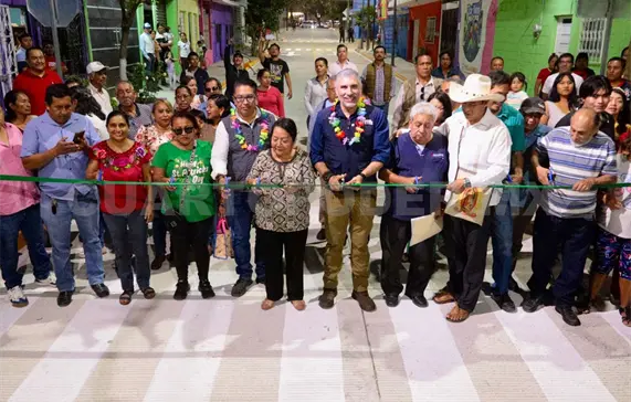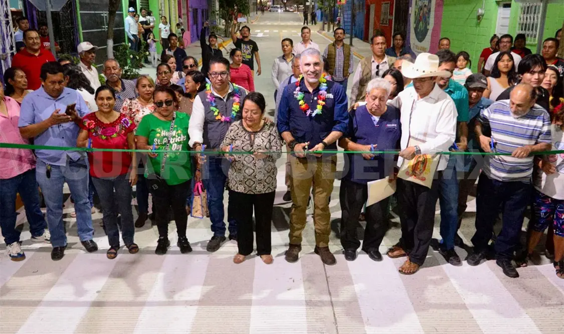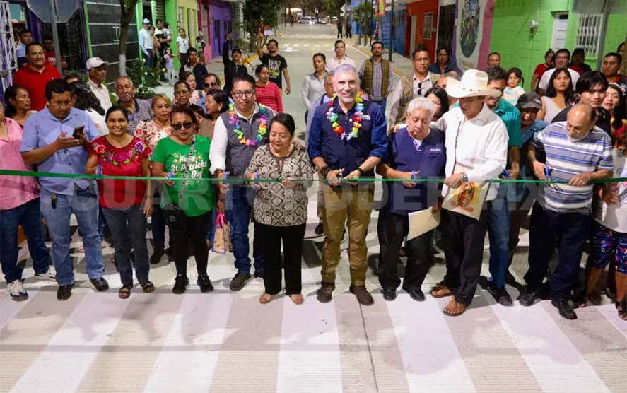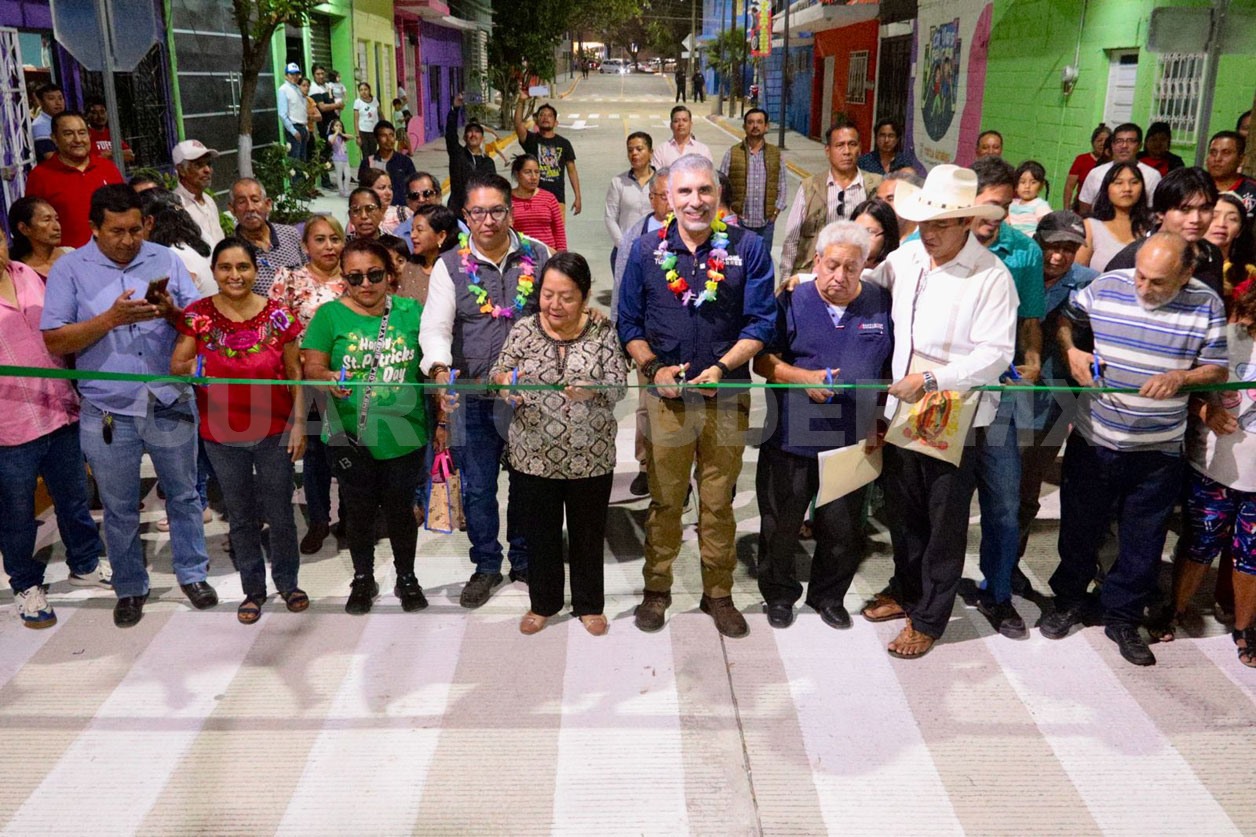 Al cortar el listón inaugural de más de 160 metros lineales de pavimentación con concreto hidráulico, banquetas, señalética, servicios básicos y pintura en la fachada de las viviendas, el alcalde capitalino explicó que esta obra mejora la movilidad y la calidad de vida de las familias, a través de una calle digna, segura y de calidad.