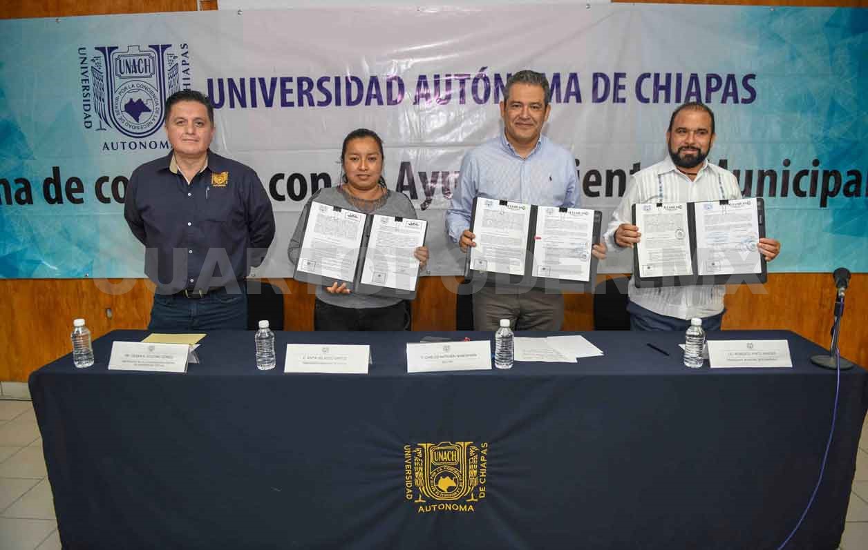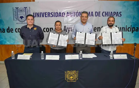 El rector de la Universidad Autónoma de Chiapas, Carlos F. Natarén Nandayapa, suscribió un convenio de colaboración con los Ayuntamientos de Sitalá y Altamirano, que encabezan los presidentes municipales, Anita Velasco Santiz y Roberto Pinto Kanter, respectivamente.