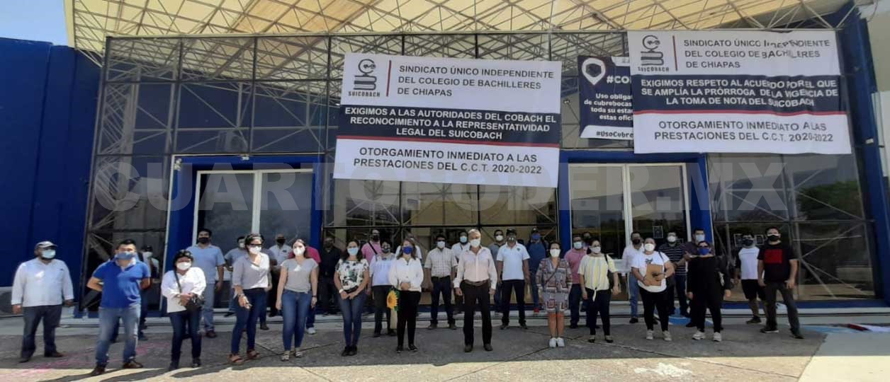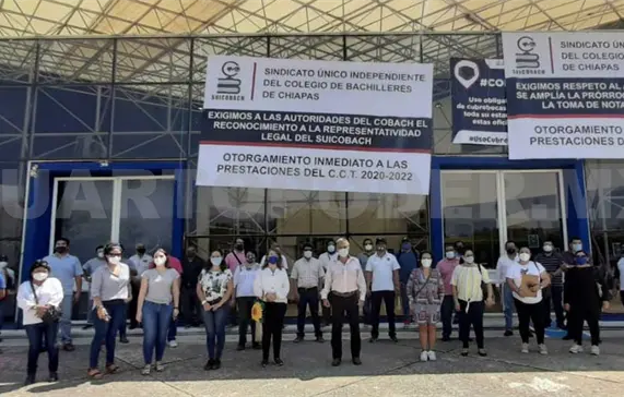 Los integrantes del sindicato también colocaron una lona, en la que exigieron el otorgamiento de las prestaciones laborales para el periodo 2020-2021. Sobre el problema del reconocimiento de la actual dirigencia, el Centro Federal de Conciliación y Registro Laboral del gobierno de la República puntualizó que “se archiva la solicitud formulada por el Sindicato Único Independiente del Colegio de Bachilleres de Chiapas, toda vez que el contrato colectivo de trabajo que adjunta se encuentra vigente”.