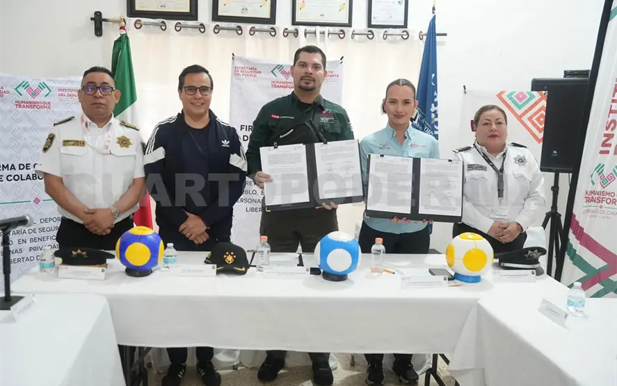 El secretario de Seguridad del Pueblo, Óscar Alberto Aparicio Avendaño, y la directora general del Instituto del Deporte del Estado de Chiapas (Indeporte), Bárbara Altúzar, firmaron un Convenio de Colaboración Interinstitucional en el Centro de Internamiento Especializado para Adolescentes (CIEA) “Villa Crisol”, acompañados del subsecretario de Ejecución de Sanciones Penales y Medidas de Seguridad, Zeín Jerónimo Gil y del presidente municipal de Berriozábal, Jorge Acero, con el objetivo de fortalecer las actividades físicas y deportivas como parte fundamental del proceso de reinserción social.