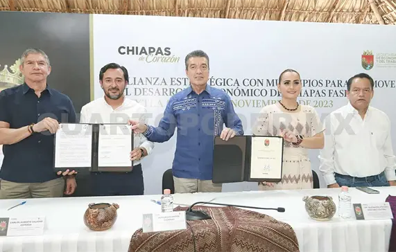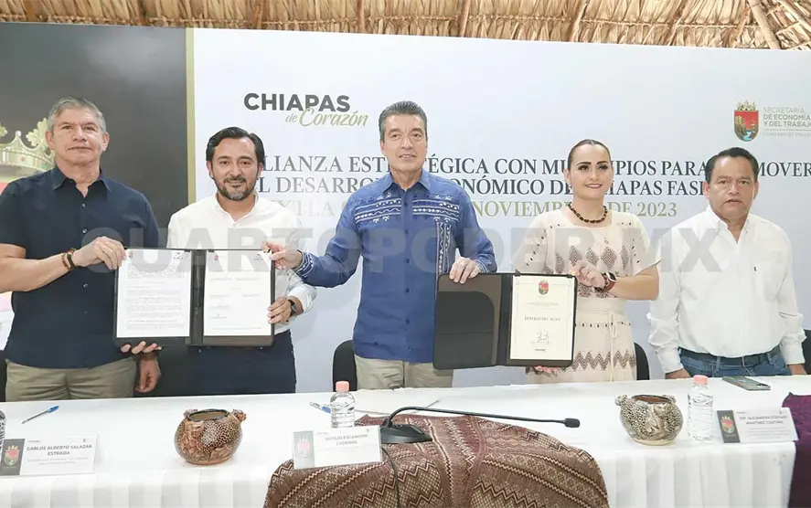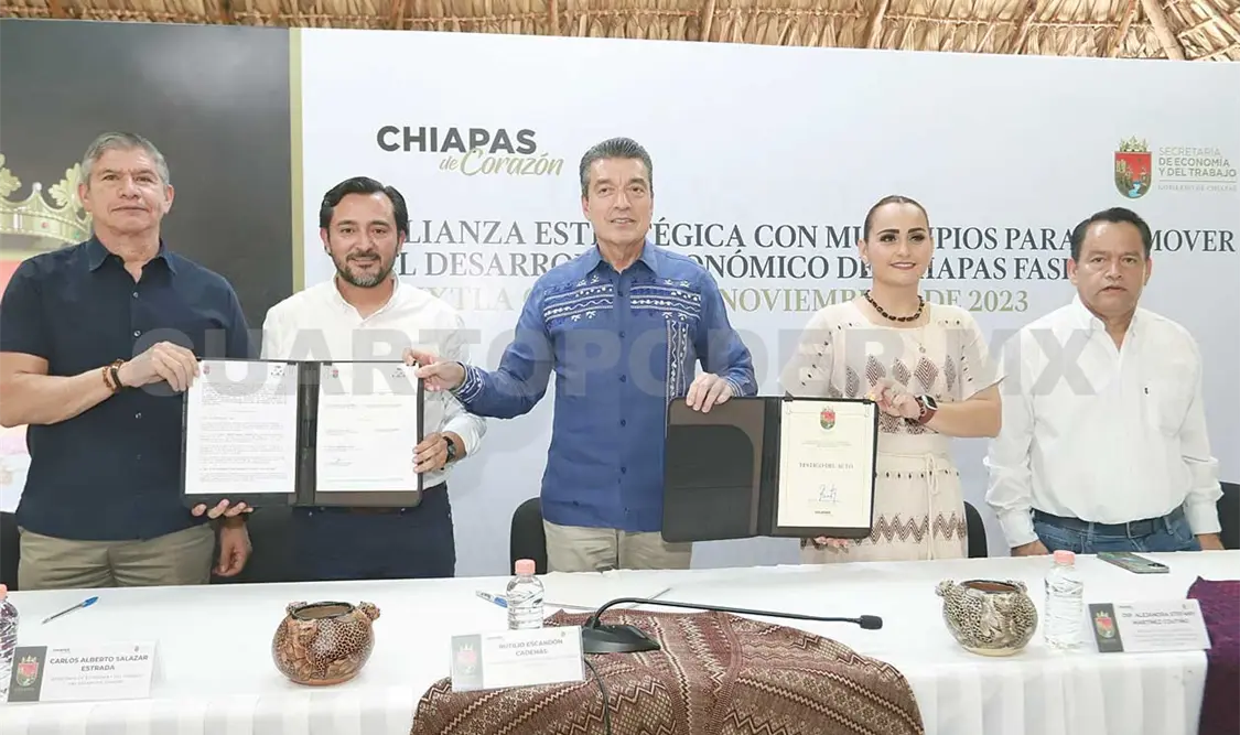 El gobernador Rutilio Escandón Cadenas encabezó la “Fase II de la Alianza Estratégica con Municipios para Promover el Desarrollo Económico de Chiapas”, en la que 15 ayuntamientos firmaron un convenio de colaboración con el Gobierno del Estado, con el fin de atraer inversiones, impulsar a las empresas, así como a la generación de empleo, autoempleo, capacitación y vinculación laboral.