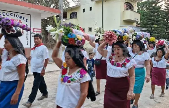 El contingente fue amplio, se extendió alrededor de tres cuadras, en el que resaltaban los hombres que en su mayoría vestían camisa blanca con paliacates rojos, y las mujeres que con blusas blancas adornadas de flores, portaban en su cabeza toles para la tortilla con flores de múltiples colores. Al frente del contingente una cruz cubierta de flores de mayo.