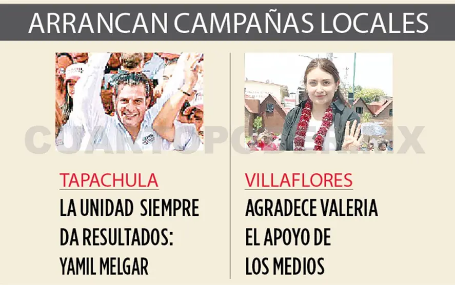 En Tapachula, son 11 personas las que buscan ser alcaldes. El candidato que lidera las preferencias es Yamil Melgar, por Morena, quien dio el siguiente mensaje: “La unidad siempre da buenos resultados, por ello agradezco a mis amigos Rosy Urbina, Freddy Escobar Sánchez, Jesús Domínguez; a todos los transportistas, empresarios y sociedad civil, por sumarse a este arranque de campaña. El respeto, la unidad y la armonía es la bandera que nos acompañará durante este proceso electoral”.