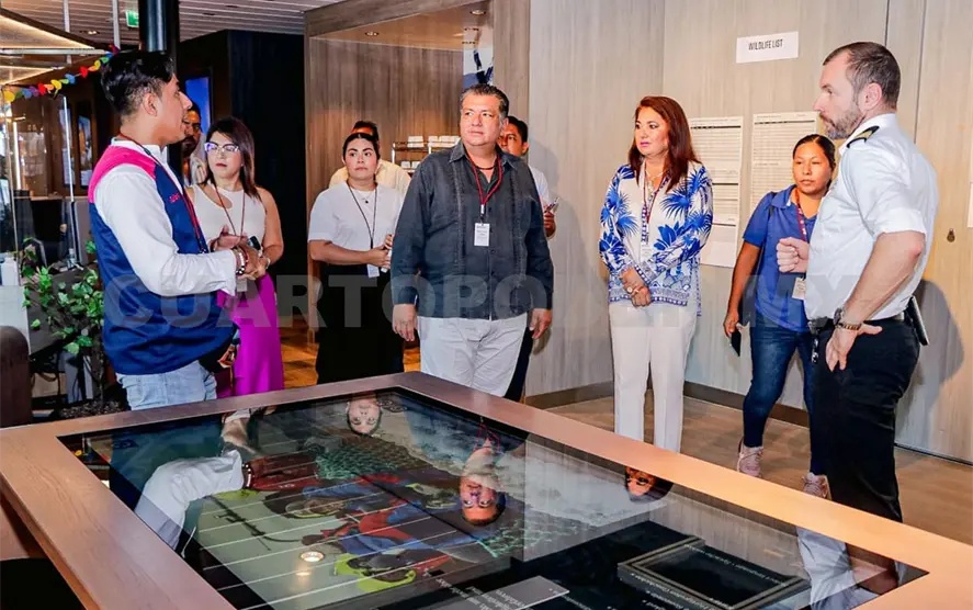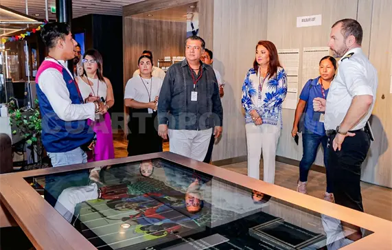 Luego del intercambio de placas conmemorativas con el capitán del barco, Gandal Bent, y en compañía de Jorge López Morales, gerente de Administración y Finanzas Portuaria, y Raquel Gálvez Gálvez, gerente de comercialización, realizaron un recorrido por la embarcación de la empresa Hurtigruten, que por primera ocasión arriba a tierras chiapanecas.