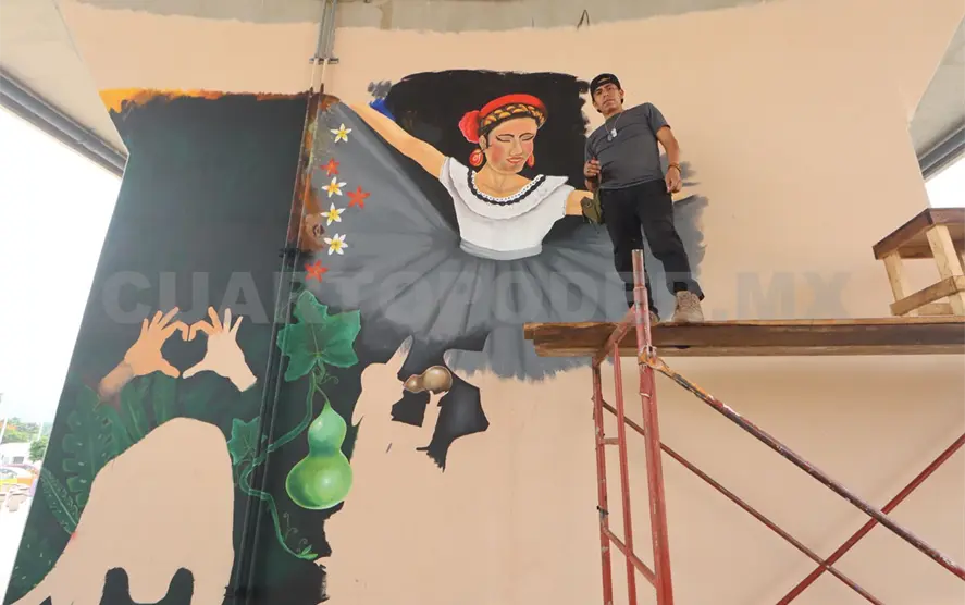En medio del tráfico y el concreto de la ciudad, un muro del puente vehicular a un costado de la Torre Chiapas se ha convertido en un inesperado lienzo de resistencia cultural. Allí, con pincel en mano, el artista chiapaneco Eduardo López Gómez, mejor conocido como “Mucha Lalo”, da vida a un mural que busca capturar la esencia de la cultura zoque, una herencia que, pese a su riqueza, se encuentra en riesgo de olvido.