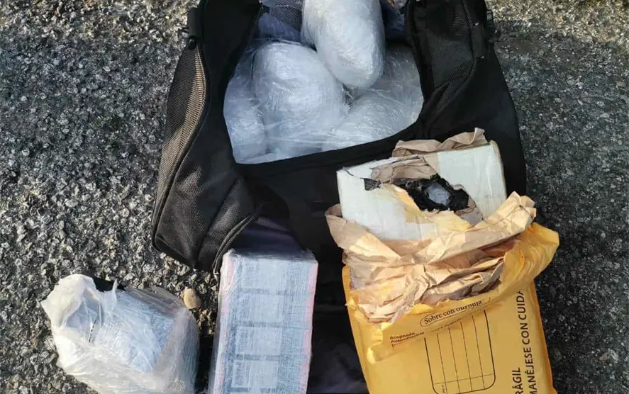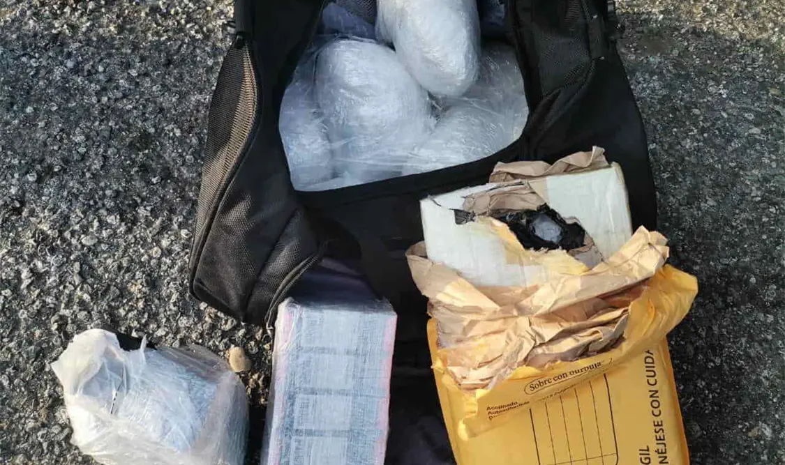 Al realizar la inspección de rutina, dentro del guarda equipaje, localizaron una mochila negra en la que había nueve envoltorios confeccionados con plástico, cada uno de ellos con una sustancia sólida fragmentada, con las características de la metanfetamina (cristal), la que arrojó un peso aproximado de ocho kilos 500 gramos.