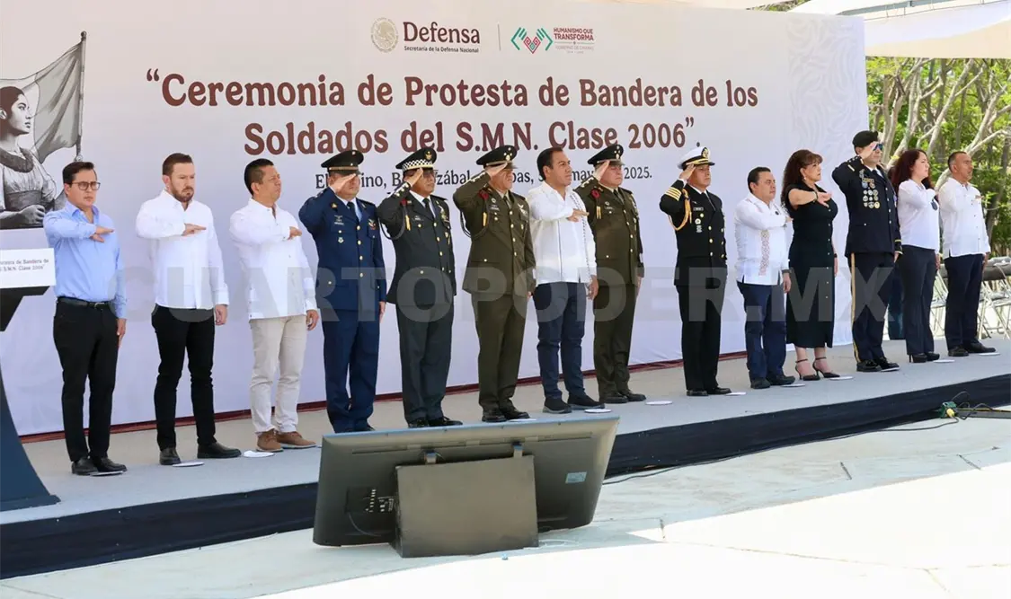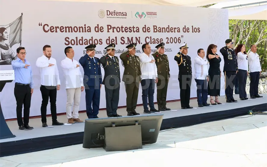 Desde las instalaciones del 3er. Regimiento de Artillería El Sabino, acompañado por el comandante de la VII Región Militar, Alejandro Vargas González; el comandante de la 31 Zona Militar, Juan Ignacio Hernández Velasco; y los representantes de la Región Aérea del Sureste, Germán Toribio Arrazola; de la 22 Zona Naval, José Antonio Mejía; y de la Guardia Nacional en Chiapas, José Gregorio Pérez Juana, el mandatario presenció este acto solemne en el que las y los jóvenes soldados juraron defender la Bandera Nacional y refrendaron su amor, lealtad y compromiso con la patria.