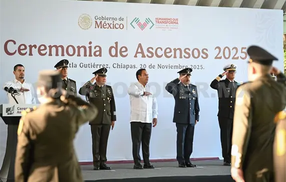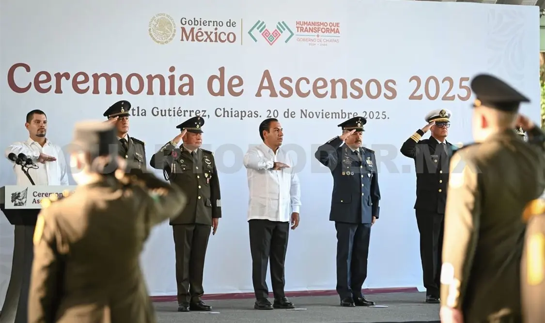 El gobernador de Chiapas, Eduardo Ramírez Aguilar, asistió a la Ceremonia de Ascensos 2025 del personal de la Secretaría de la Defensa Nacional (Defensa). Tras agradecer la invitación al comandante de la Séptima Región Militar, Alejandro Vargas González, el mandatario reafirmó el compromiso del gobierno de la Nueva ERA de mantener una coordinación permanente para fortalecer la paz, la seguridad y el bienestar del pueblo de Chiapas.