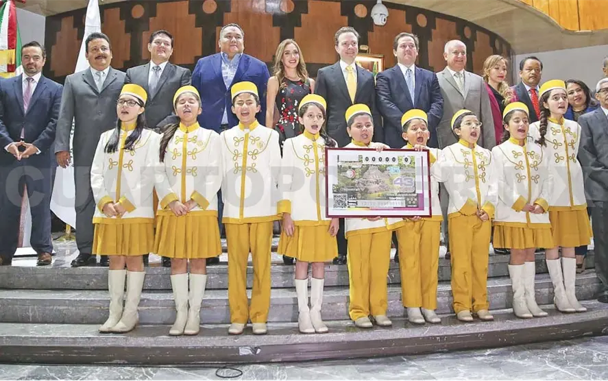 Luego de que el director general de la Lotería Nacional entregara la réplica del billete conmemorativo, el gobernador Velasco realizó el toque de la campana del inicio del sorteo junto a las niñas y niños gritones.