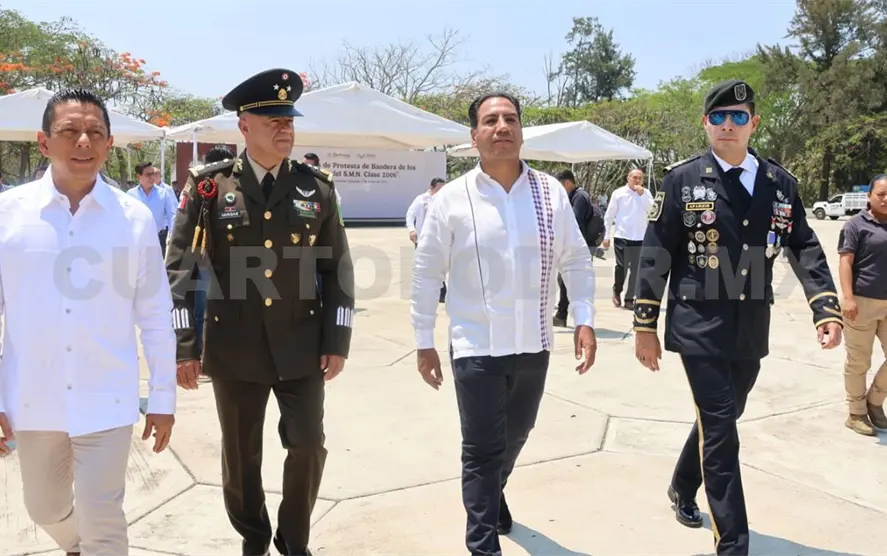 El titular de la Secretaría de Seguridad del Pueblo (SSP), Óscar Alberto Aparicio Avendaño, asistió a la ceremonia de Protesta de Bandera de los Soldados del Servicio Militar Nacional Clase 2006, que encabezó el gobernador del Estado, Eduardo Ramírez Aguilar, y general de Brigada del Estado Mayor, Alejandro Vargas González, comandante interino de la Séptima Región Militar.