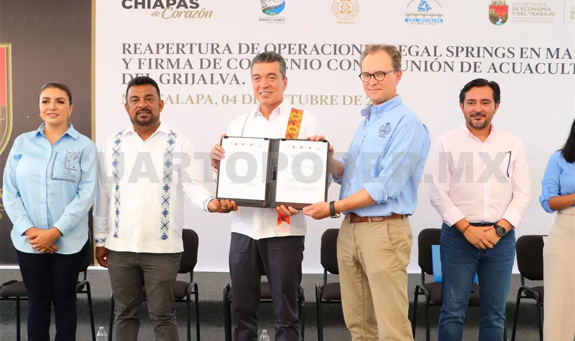 En Mezcalapa, el gobernador Rutilio Escandón Cadenas atestiguó la reapertura de operaciones de Regal Springs México- Acuagranjas Dos Lagos y la firma de memorándum de entendimiento con la Unión Pesquera, Acuícola y Agropecuaria del Grijalva, donde reconoció el esfuerzo conjunto entre las autoridades y los representantes empresariales y organizaciones sociales por lograr este acto que garantiza la resolución de cualquier conflicto, procura la reconciliación y establece una relación amigable.