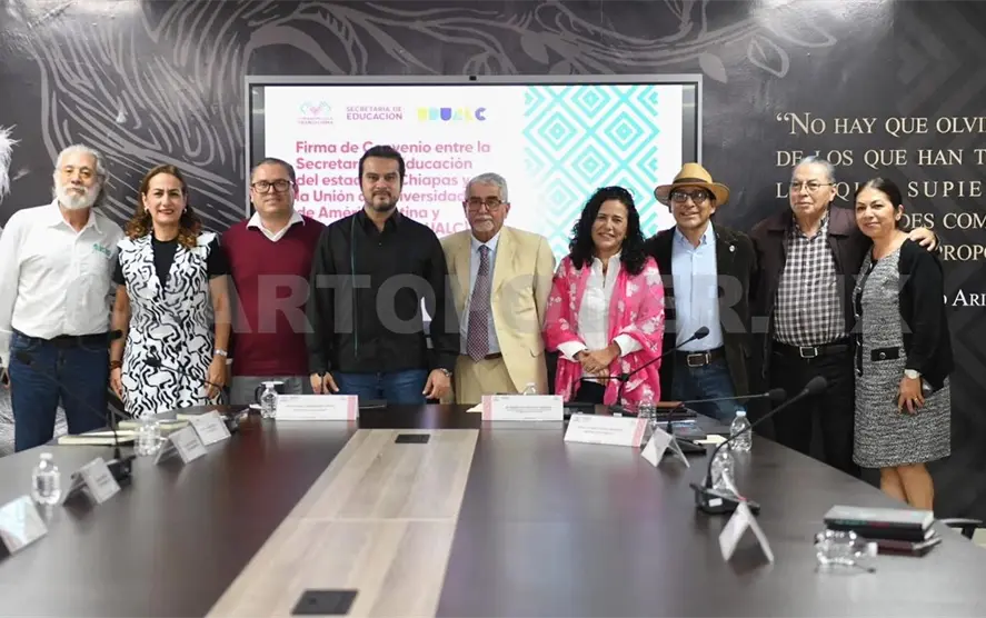 El rector de la Universidad Autónoma de Chiapas (Unach), Oswaldo Chacón Rojas, así como rectores y rectoras de las universidades estatales atestiguaron la firma del convenio general entre la Secretaría de Educación del Estado y la Unión de Universidades de América Latina y el Caribe A. C. (Udualc).