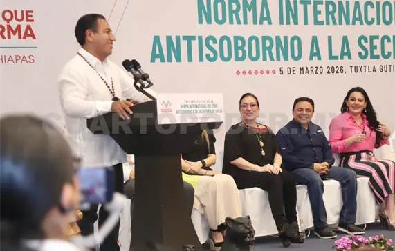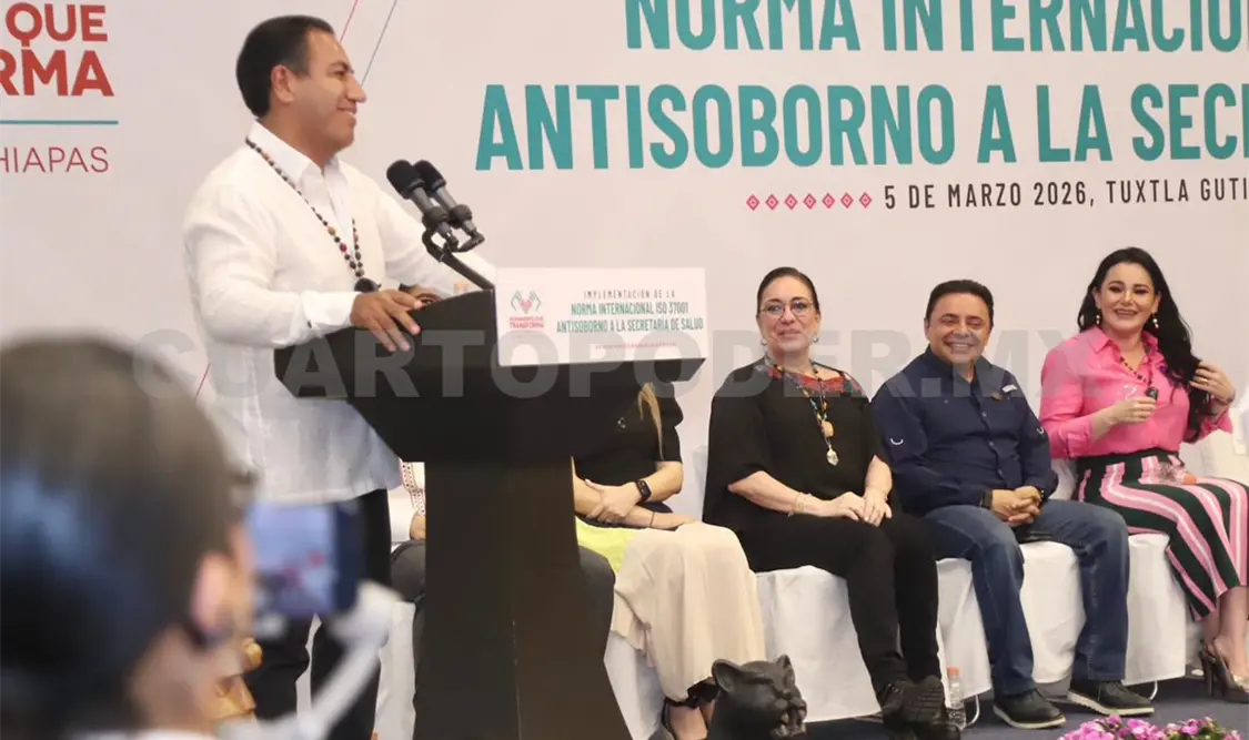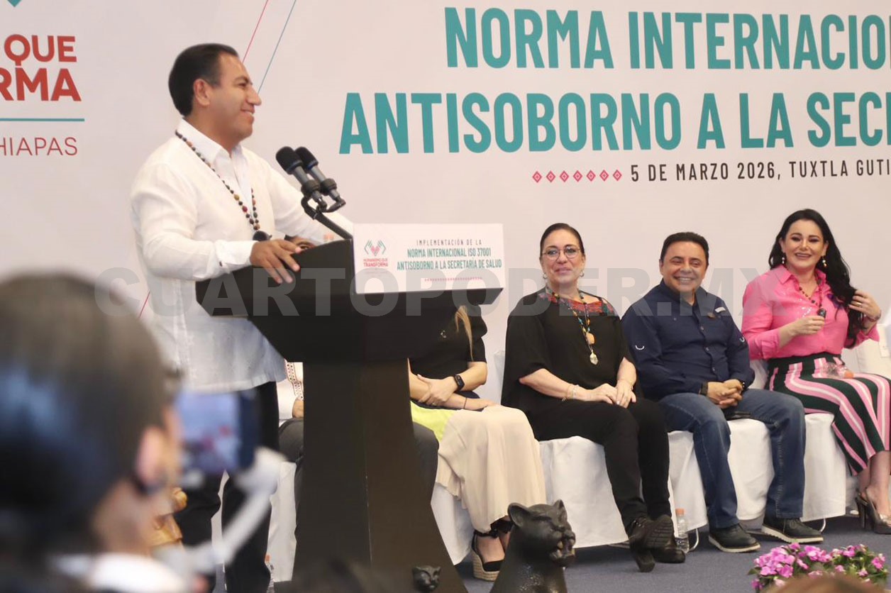 El magistrado presidente del Poder Judicial del Estado (PJE) de Chiapas, Juan Carlos Moreno Guillén, participó en la ceremonia de implementación de la Norma Internacional ISO 37001 Antisoborno a la Secretaría de Salud (SSA) del estado de Chiapas, en un acto encabezado por el gobernador Eduardo Ramírez Aguilar, junto a la secretaria de Anticorrupción y Buen Gobierno, Ana Laura Romero Basurto, y el secretario de Salud, Omar Gómez Cruz, en las instalaciones del Polyforum Chiapas.