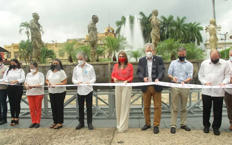 La alcaldesa Rosa Irene Urbina Castañeda, acompañada por el artista y embajador de la Unicef, Jorge Marín; el representante en México de la Unicef, Fernando Carrera Castro; el coordinador residente de las Naciones Unidas, Peter Grohmann; y el representante en México del Acnur, Giovanni Lepri, cortaron el listón inaugural de la obra en el Parque Central “Miguel Hidalgo”.