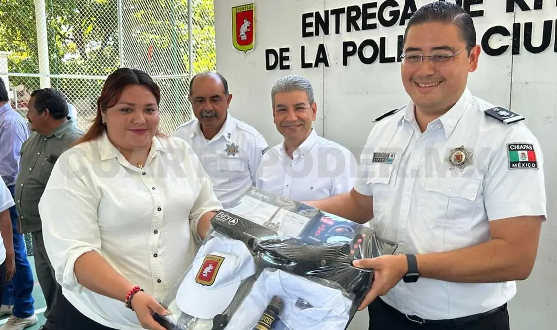 Acompañado del secretario de Movilidad y Transporte, Aquiles Espinosa García, el titular de la Secretaría de Seguridad Pública Municipal, Jorge Alexis Zuart, en representación del presidente con permiso, Carlos Morales, encabezó la entrega de 300 kits de dignificación a su labor a policías ciudadanos solidarios.