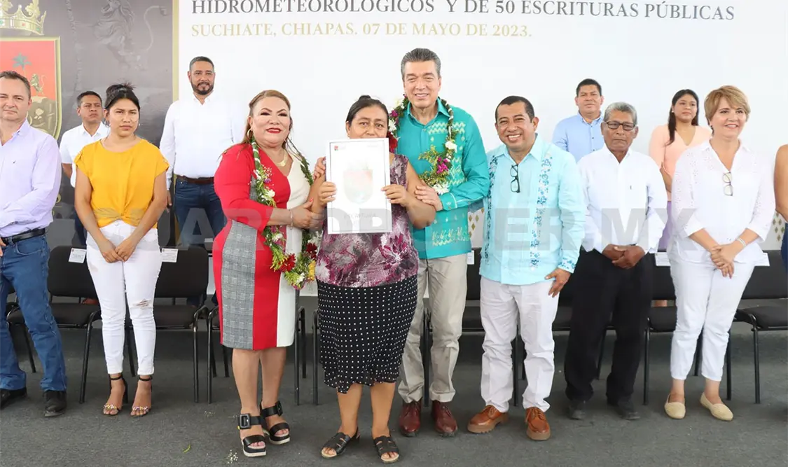 En el municipio de Suchiate, el gobernador Rutilio Escandón Cadenas realizó la entrega de 50 escrituras públicas a habitantes del fraccionamiento San Caralampio 2, por lo que, desde este municipio fronterizo, reiteró que se continuarán consolidando acciones que garanticen seguridad patrimonial a las familias chiapanecas.