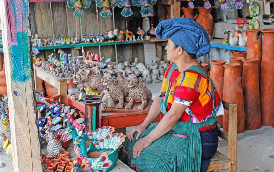 Vestidas con falda azul, ropa alta blanca, rojo y amarillo, además de un manto en la cabeza, las mujeres alfareras permanecen con sus hijos desde las siete de la mañana hasta las ocho de la noche dentro de los negocios, esperando vender sus creaciones.