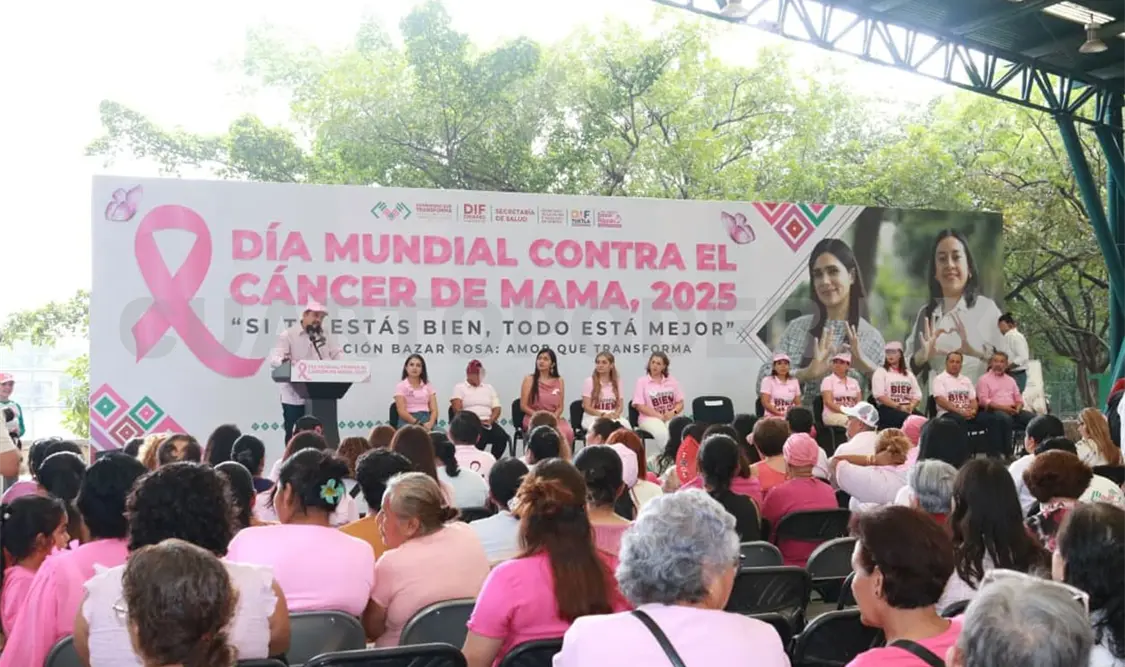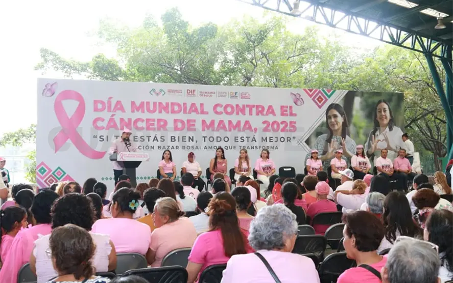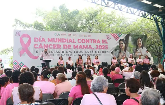 “En Chiapas la salud de las mujeres es primero, en este 2025 se da seguimiento al 100 por ciento de las pacientes con cáncer de mama, mientras que en 2024 solo el 15 por ciento de los casos tuvo seguimiento. Además, con la filosofía humanista del gobernador Eduardo Ramírez Aguilar, en 2026 y 2027 será una realidad contar con la más alta tecnología con equipos de radioterapia y tratamiento para todo tipo de cáncer, destacó el secretario de Salud del estado, Omar Gómez Cruz, al encabezar el evento conmemorativo del Día Mundial contra el Cáncer de Mama.