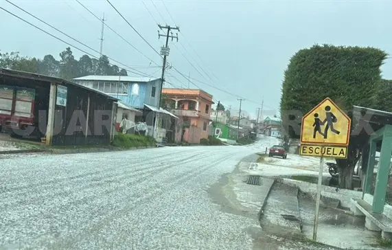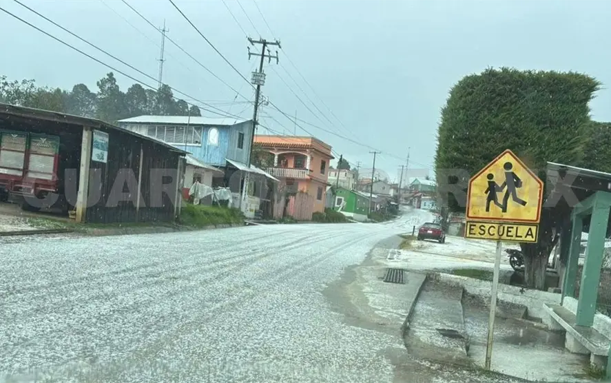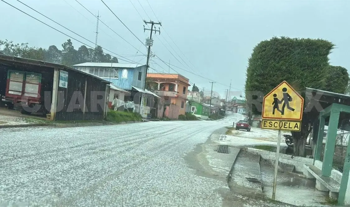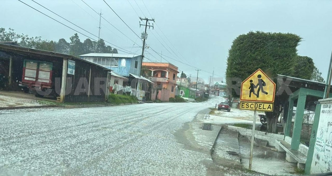 Autoridades tradicionales informaron que primeramente se escuchó un rayo, minutos después vino la lluvia y granizada, quedando cubierto de hielo los campos, carretera y techos de las viviendas.