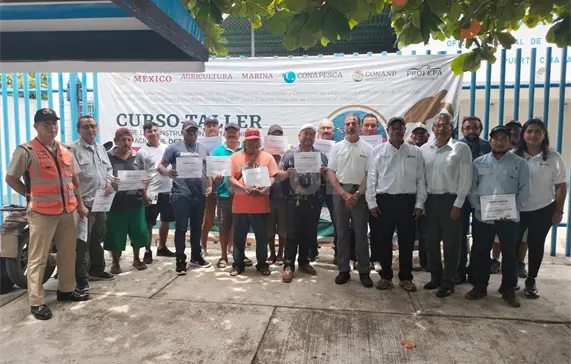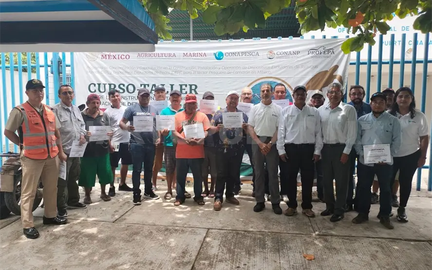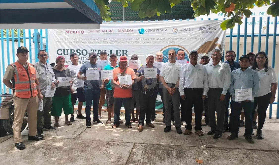 Trabajadores de embarcaciones pesqueras camaroneras fueron capacitados en Puerto Chiapas, como parte del Programa de Concientización y Capacitación en la Construcción, Instalación y Operación de Dispositivos Excluidores de Tortugas Marinas y de Peces (DET y DEP), reglamentario para poder realizar su actividad.