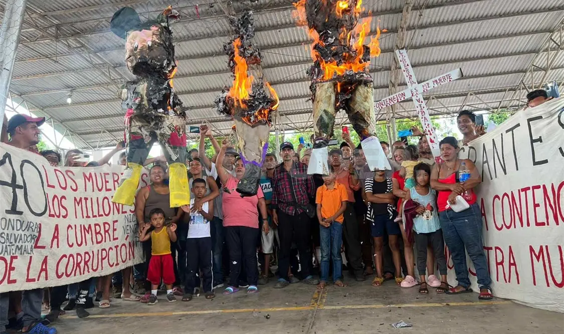 La caravana de migrantes —que partió el pasado lunes de Tapachula— se mantiene en el municipio de Huixtla, a 41 kilómetros del punto de partida, como medida de protesta y presión para que les entreguen documentos para poder continuar su viaje hacia la frontera norte con Estados Unidos. El pasado jueves, algunos hombres y mujeres suturaron sus labios, y ayer viernes quemaron piñatas alusivas a personajes identificados con el INM.