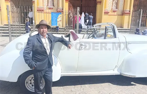 Como si fuera una novia que lleva al altar, Carlos Courtois Guillén cuida su vehículo Hudson modelo 1937; tiene 88 años de antigüedad y desde hace algunas décadas renta para bodas o 15 años.