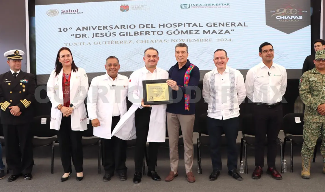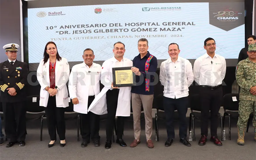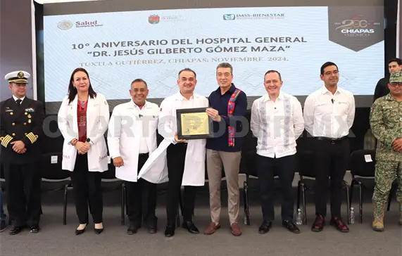 Recordó que “los hospitales del IMSS-Bienestar brindan continuidad a los cuidados de los pacientes referidos desde otros niveles, con un enfoque acorde a la complejidad del padecimiento y con un sentido humanista para la persona y la familia. El hospital Gómez Maza es valioso no solo para Chiapas sino para la región, por eso en este décimo aniversario felicitamos a todo el personal porque cada uno es pieza clave para que esta unidad funcione y produzca salud a la población”.