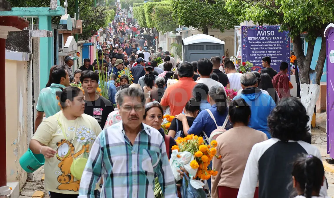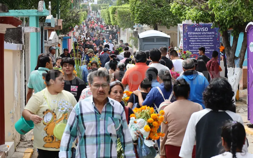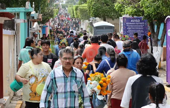 Los colores amarillo y morado de las flores de cempasúchil y de seda formaron una gran marea que prácticamente cubrió los pasillos del panteón municipal de Tuxtla Gutiérrez, en donde la música tradicional mexicana, las maderas que cantan, el sonido de los tambores y pitos, así como el del organillo, se mezcló con las voces de cantantes mexicanos consagrados, entre las que destacó la voz de Pedro Infante.
