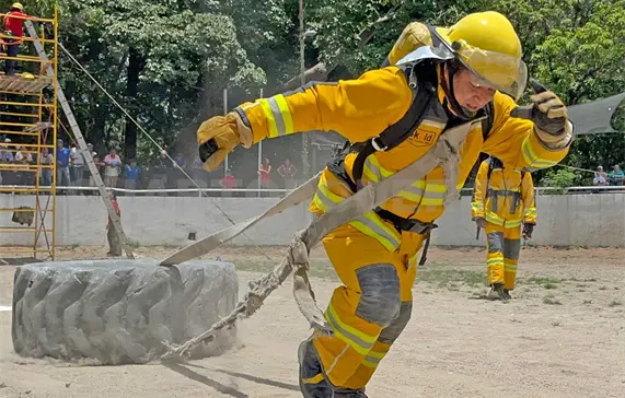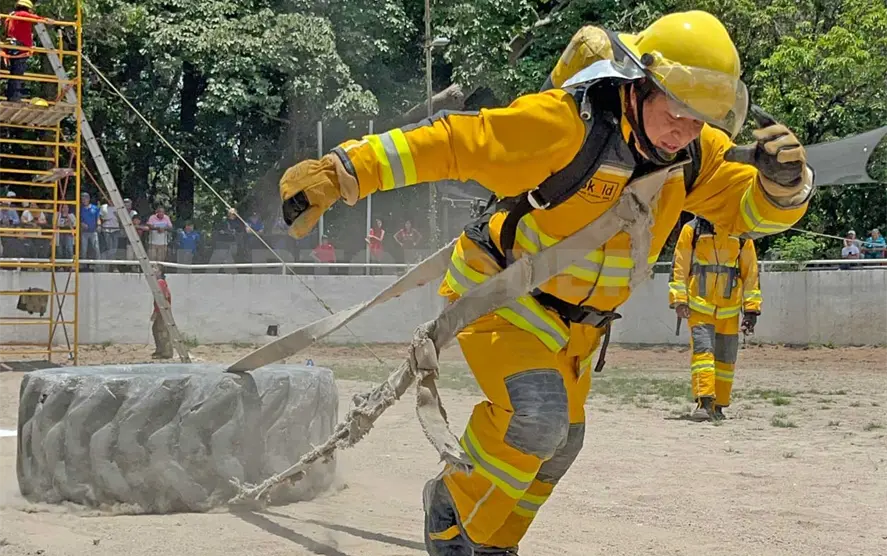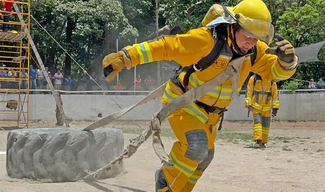 Apagar el fuego con un extintor, utilizar la manguera con presión, subir escaleras en un andamio al mismo tiempo que se carga una manguera, utilizar el mazo, internarse en un espacio reducido, liberar un cuerpo dentro de una tubería, pasar a rastras un espacio confinado y con una red de lazos que impide el avance rápido y arrastrar la rueda neumática de un tractor con un laso sujetado al cuerpo, fueron parte de las prácticas que los participantes debieron realizar.