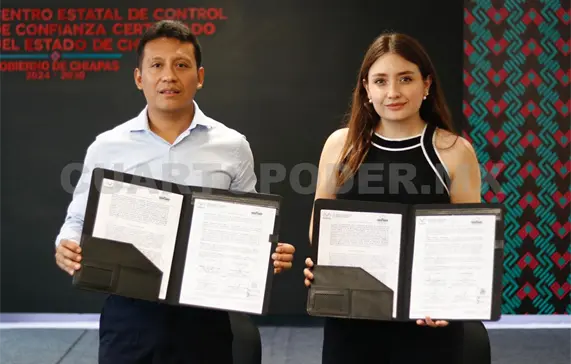 La presidenta municipal de Villaflores, Valeria Rosales Sarmiento; y el director general del Centro Estatal de Control de Confianza Certificado (CECCC), José Alonso Llaven Villarreal, firmaron el convenio de coordinación con el objetivo de garantizar que el personal a cargo de la seguridad en el municipio cuente con la certificación y capacitación necesarias para el adecuado desempeño de sus funciones.