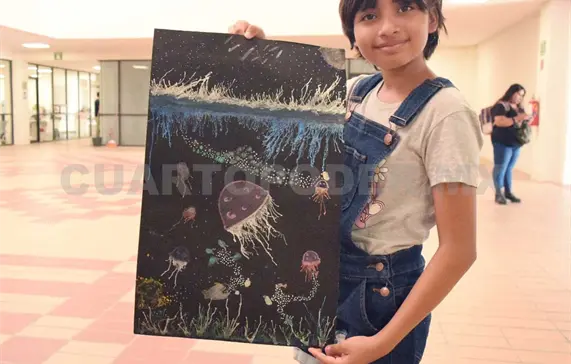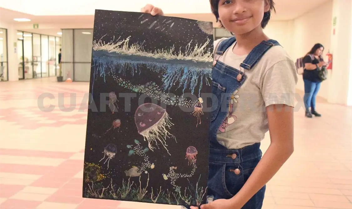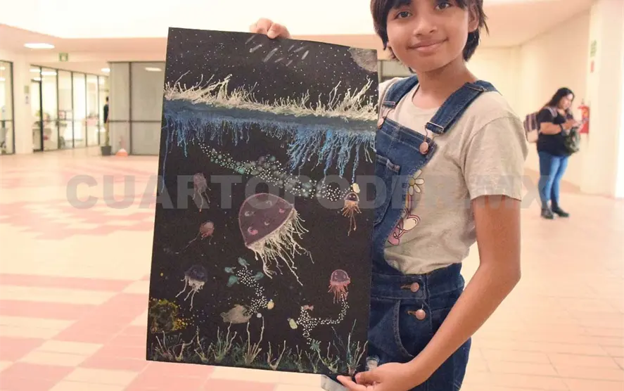 Sobre su obra, la artista Sofía comentó que se “trató sobre los microplásticos, los cuales se comen el plancton y posteriormente los peces, ballenas, medusas y especies marinas, [ciclo] en donde el ser humano termina por consumirlos”, comentó en entrevista la galardonada, quien es estudiante de la Escuela Primaria Felipe Carrillo Puerto.