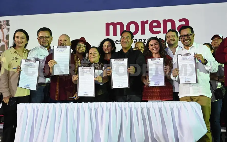 En otro momento, la secretaria general del CEN del partido guinda, Carolina Rangel Gracida, presentó el Decálogo para Autoridades Emanadas de Morena, a través del cual las y los servidores públicos se comprometen a regir su conducta bajo los 10 principios del movimiento firmado por las y los legisladores morenistas presentes.