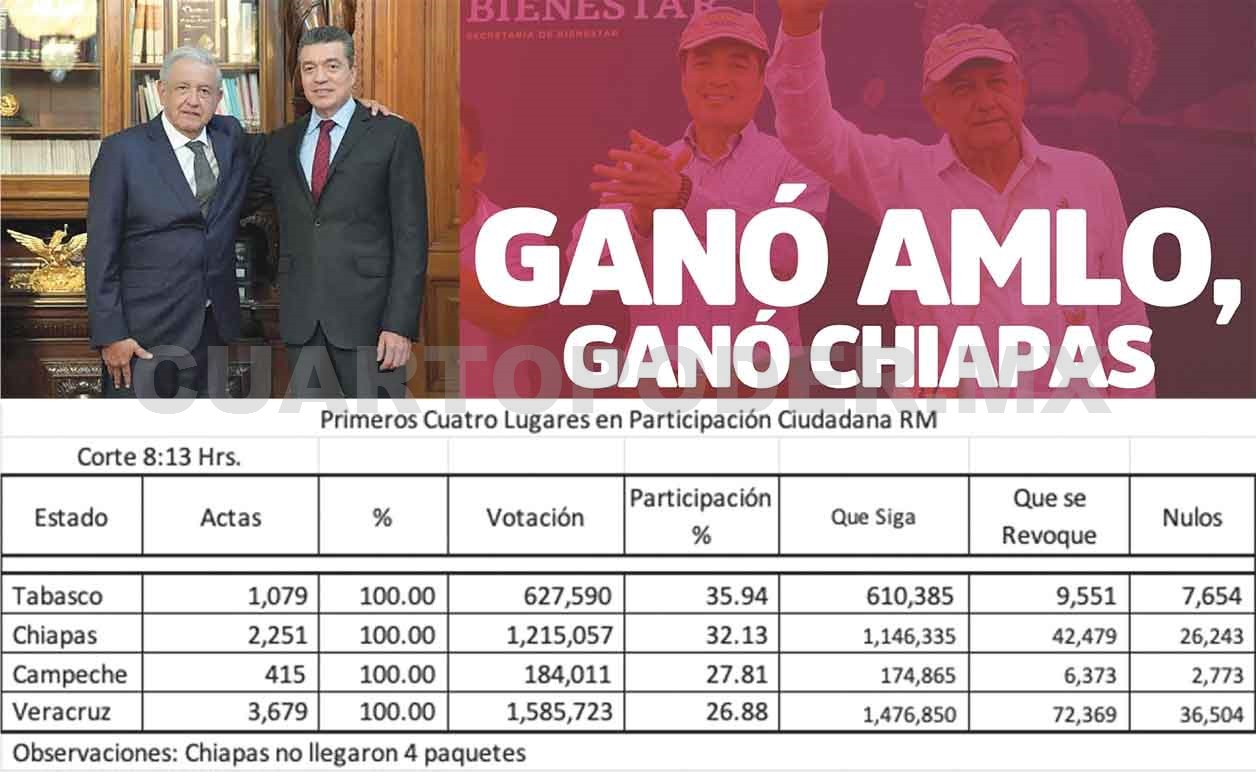 Por su parte, durante la conferencia matutina, el presidente López Obrador destacó el esfuerzo que hicieron las y los chiapanecos para ser parte de este proceso, ya que el estado se encuentra en segundo lugar en participación, pese a que “alejaron muchísimo las casillas, con el propósito de que la gente no participara”.