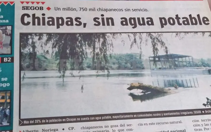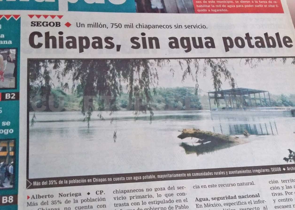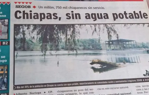 A través del Consejo Nacional de Población (Conapo), dependiente de esta Secretaría, se dio a conocer que alrededor de un millón 750 mil chiapanecos no goza del servicio primario, lo que contrasta con lo estipulado en el Informe de Gobierno de Pablo Salazar Mendiguchía, donde se manifiesta que la dotación de agua potable a la población es una prioridad.