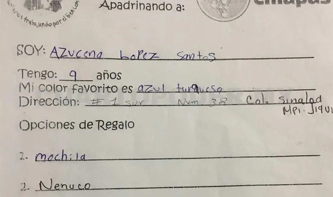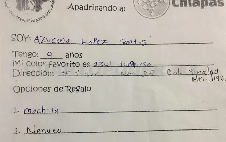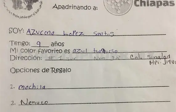 Un grupo de ciudadanos recibió cartas que niños pobres de zonas afectadas por el sismo en Chiapas, quienes escribieron con la esperanza de obtener un regalo de Navidad. Por ello, los organizadores, invitan a la ciudadanía a apadrinar un regalo y entregarlo en manos de los niños, haciéndoles realidad sus sueños.