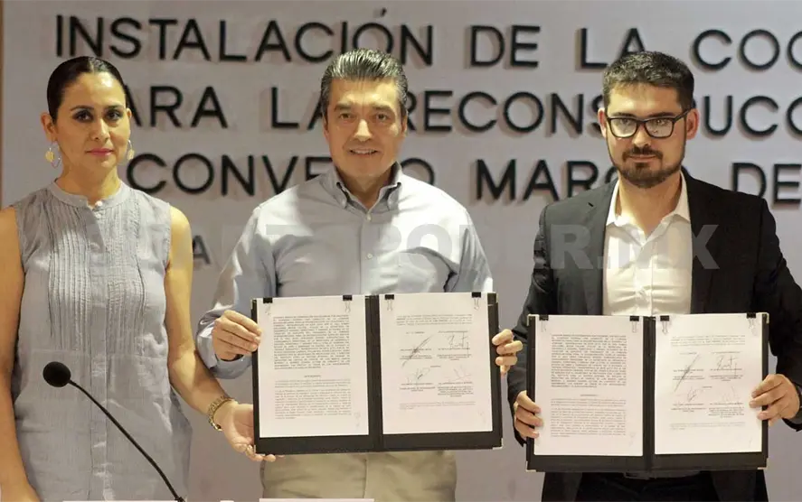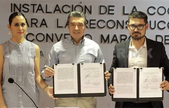 Durante este acto, realizado en la Sala Belisario Domínguez, de Palacio de Gobierno, se llevó a cabo la instalación de la Coordinación Estatal para la Reconstrucción en el marco del Programa Nacional de Reconstrucción en el Estado de Chiapas, a cargo de Román Guillermo Meyer Falcón.