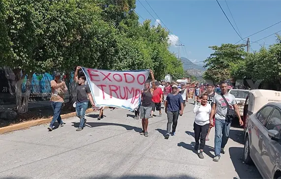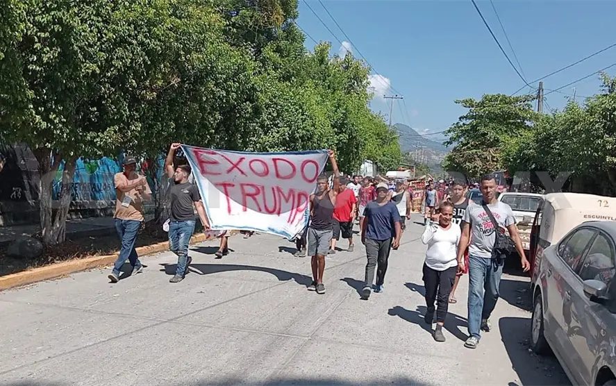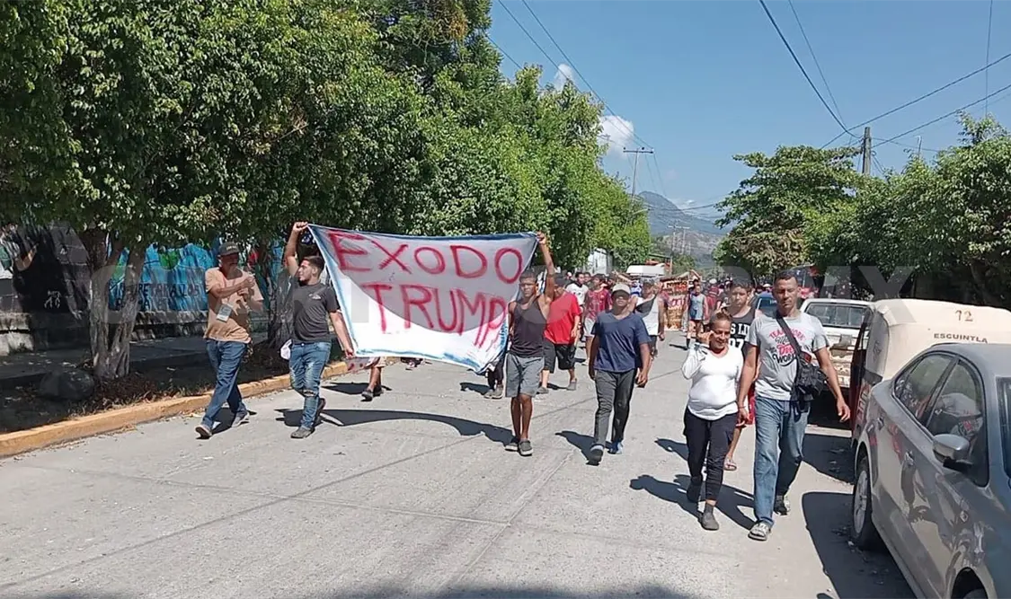 Portando una manta con la leyenda “Caravana Trump”, los extranjeros de diversas nacionalidades gritaron consignas para que los atiendan y solucionen su situación de estancia, además que les proporcionen vehículos para viajar al norte del país sin exponerse a los riesgos de la caminata y a las afectaciones a su salud.