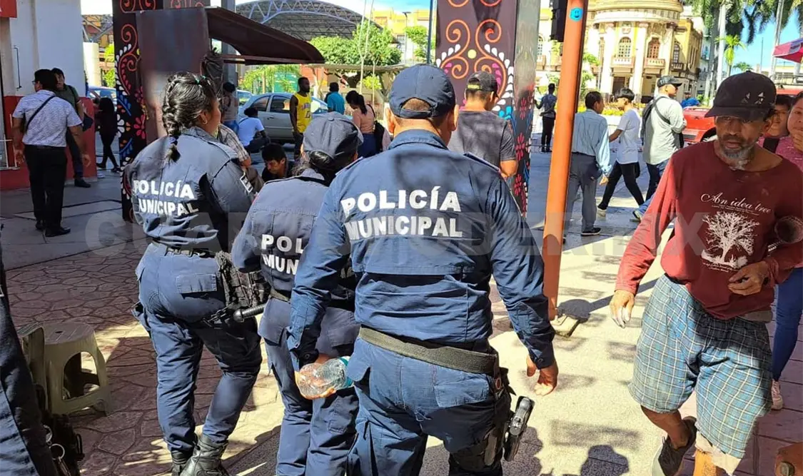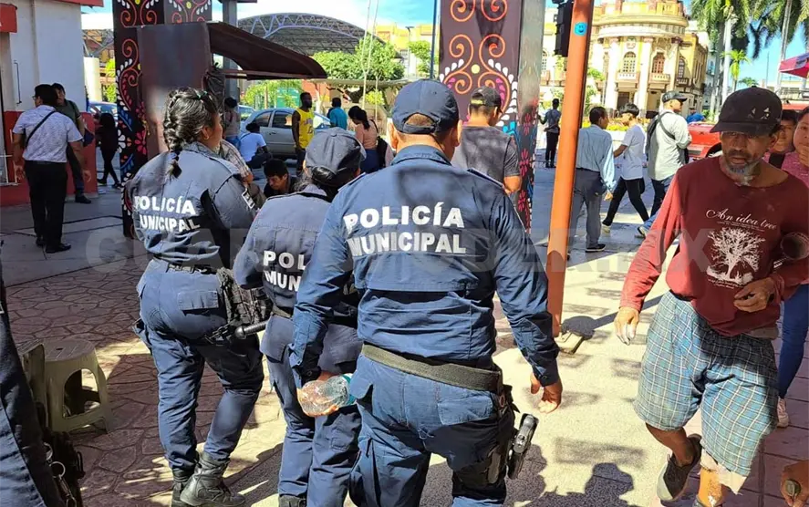 Inspectores de Servicios Públicos apoyados por elementos de la Secretaría de Seguridad Pública Municipal emprendieron operativos disuasivos de migrantes y vendimia informal en el centro de la ciudad de Tapachula, en cuyas actividades participan principalmente haitianos.