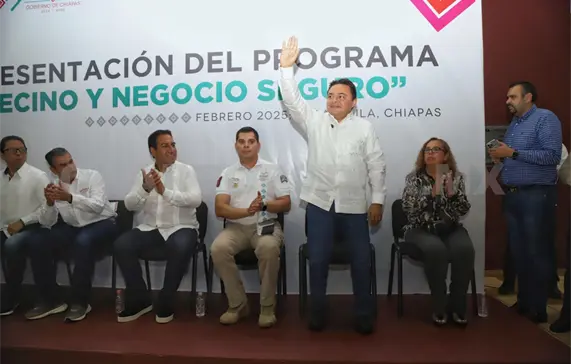Asimismo, participó en la presentación del programa Vecino y Negocio Seguro, que se realiza con el esfuerzo conjunto del gobierno estatal y municipal, y que beneficiará a la población tapachulteca con la compra e instalación de cámaras de seguridad del C5, para un mejor monitoreo y acción inmediata ante la comisión de delitos.