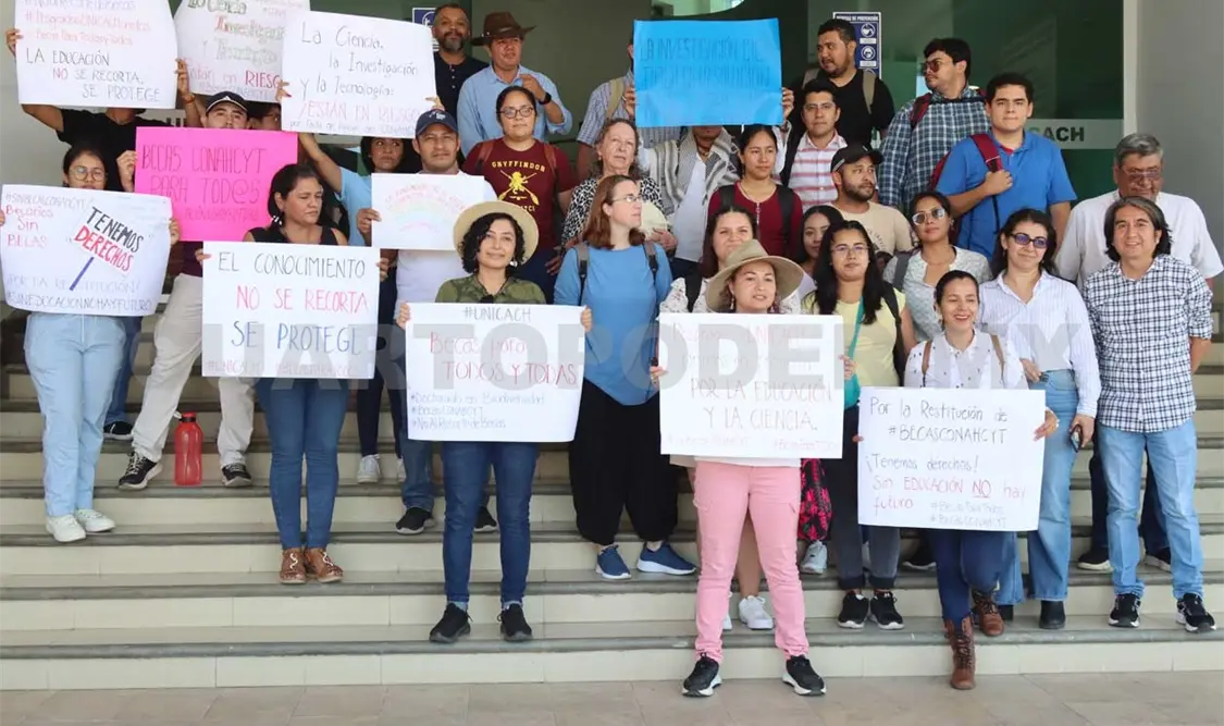 Estudiantes de diferentes posgrados de la Universidad de Ciencias y Artes de Chiapas (Unicach) se manifestaron en contra de la decisión del Consejo Nacional de Humanidades, Ciencias y Tecnologías (Conahcyt) de recortar el número de becas para investigación, ya que los limita a poder dedicar tiempo completo a sus estudios como lo estipulan los criterios para ingresar a un posgrado del registro nacional.