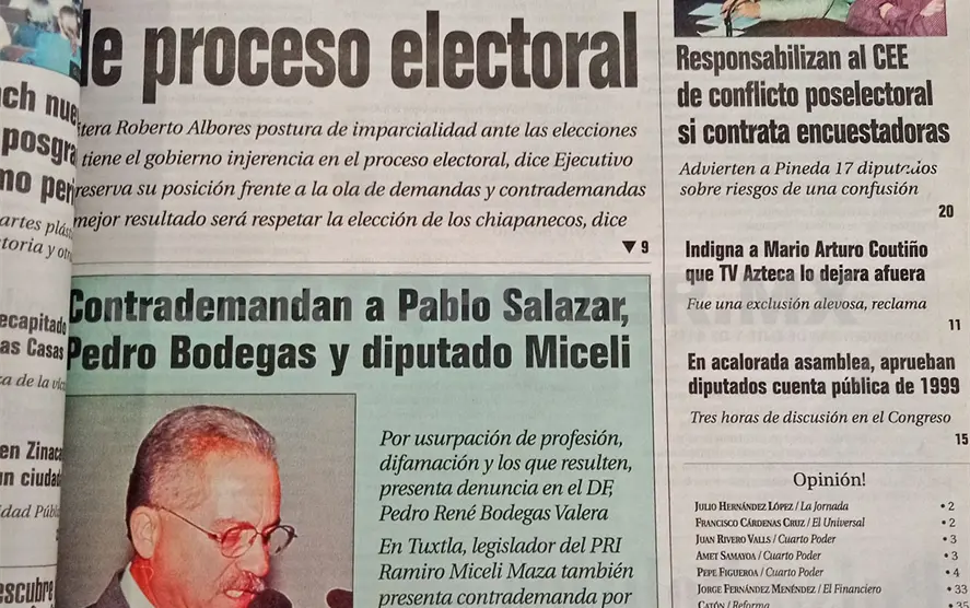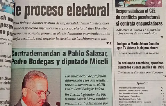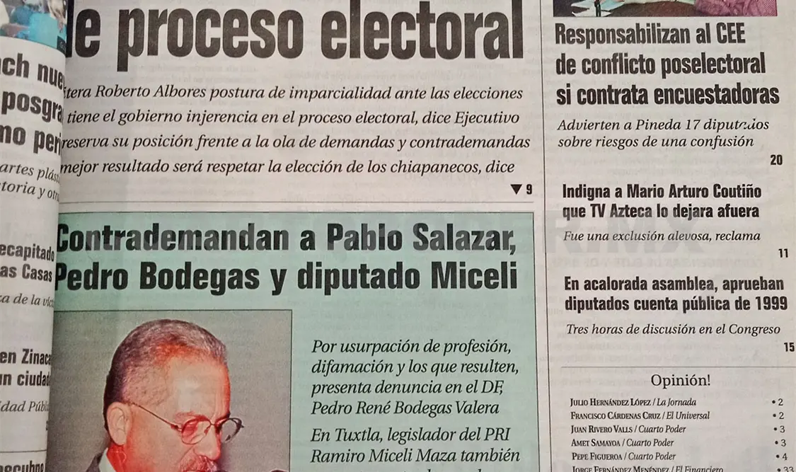 El diputado local priista, Ramiro Miceli Maza, contrademandó al candidato de la Alianza por Chiapas, Pablo Salazar Mendiguchía, por los delitos de falsificación de documentos en general, falsedad en declaraciones y en informes dados a una autoridad, usurpación de funciones públicas y de profesiones, integrándose la averiguación previa correspondiente.