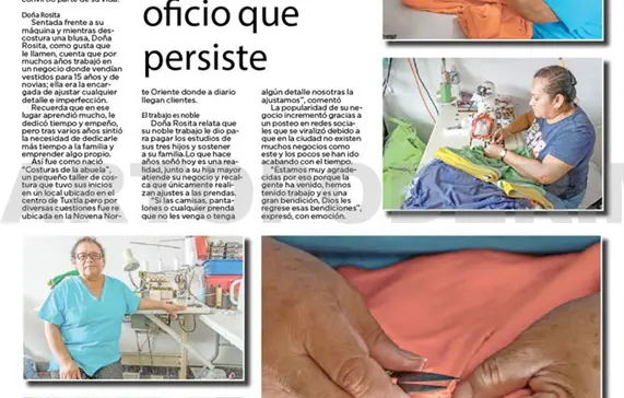 Doña Rosita relata que su noble trabajo le dio para pagar los estudios de sus tres hijos y sostener a su familia.Lo que hace años soñó hoy es una realidad, junto a su hija mayor atiende su negocio y recalca que únicamente realizan ajustes a las prendas.