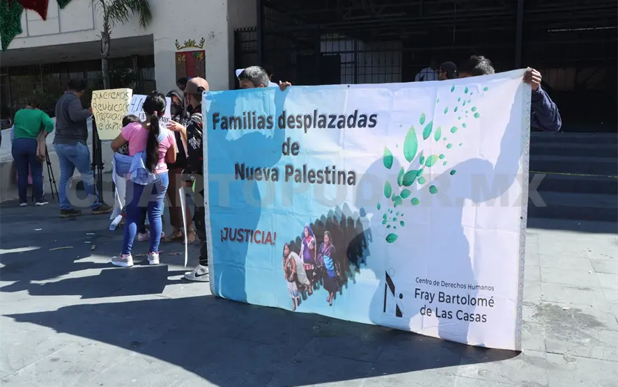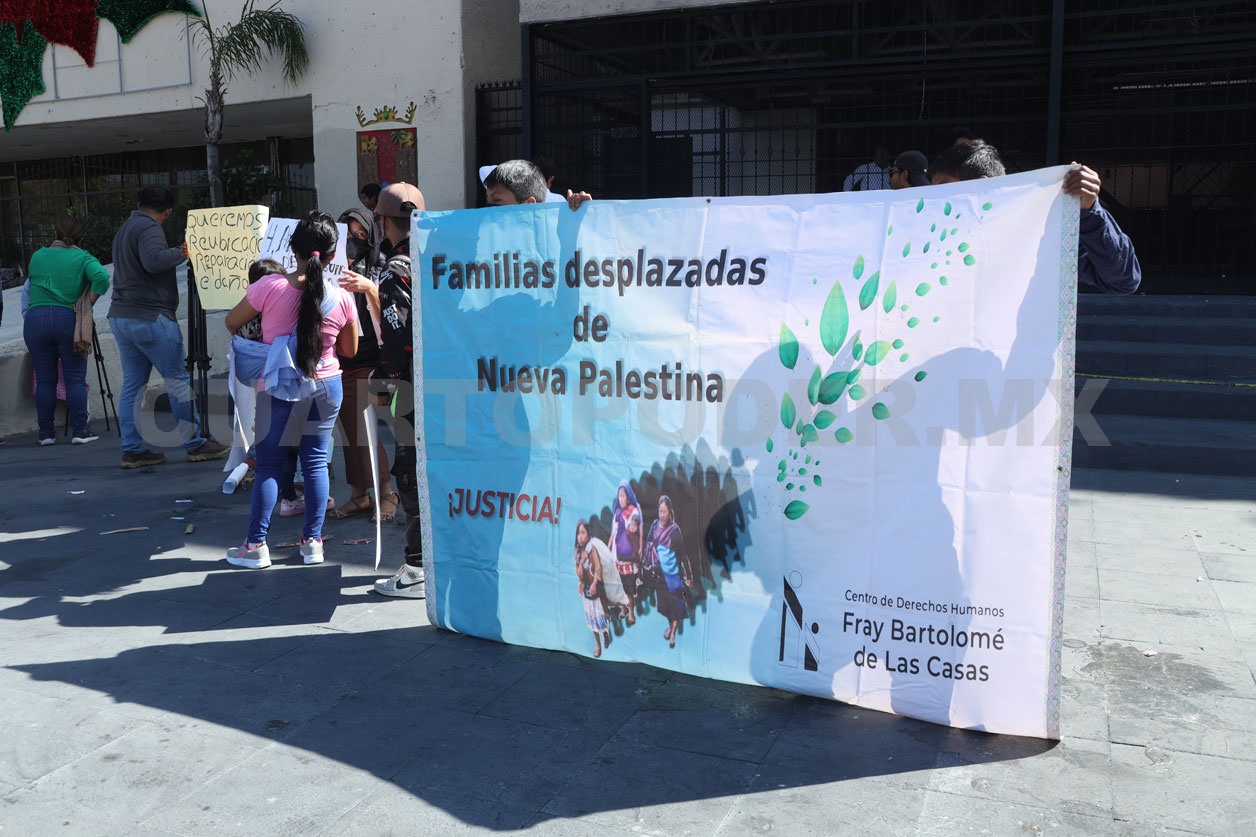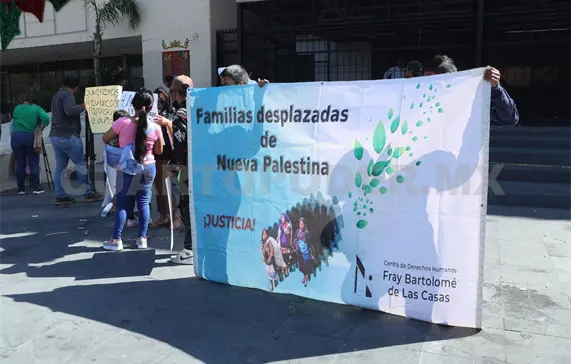 Seis familias de la comunidad Nueva Palestina perteneciente al municipio de Ocosingo, se manifestaron a las afueran del la Sede de Gobierno de Chiapas a cuatro años de haber sido desplazados de manera violenta, piden reubicación digna y justicia tras los hechos violentos que vivieron.