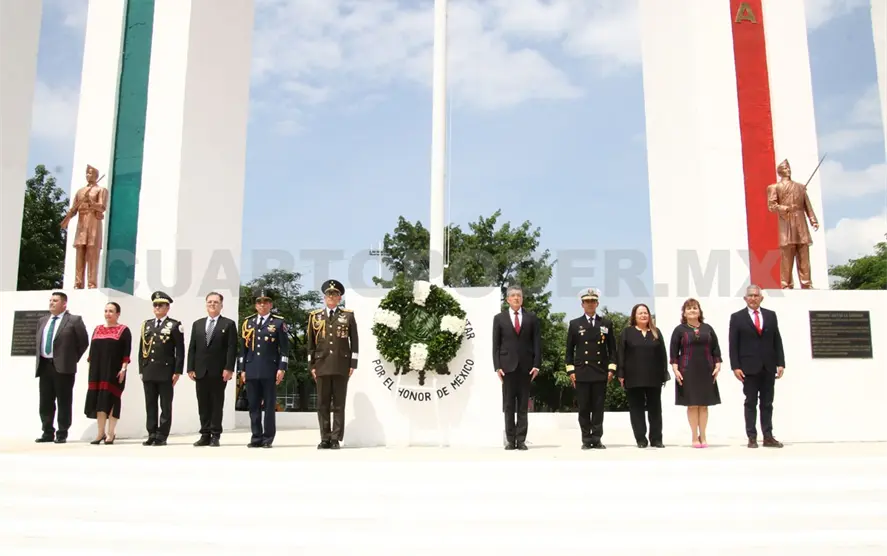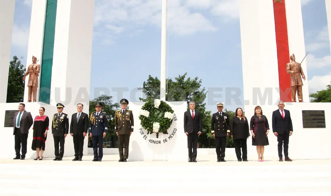 Finalmente, Rutilio Escandón y Román Villalvazo depositaron una ofrenda floral y montaron guardia de honor en el Monumento a los Niños Héroes de Chapultepec, acompañados de representantes de los poderes Judicial y Legislativo, así como autoridades militares y civiles.