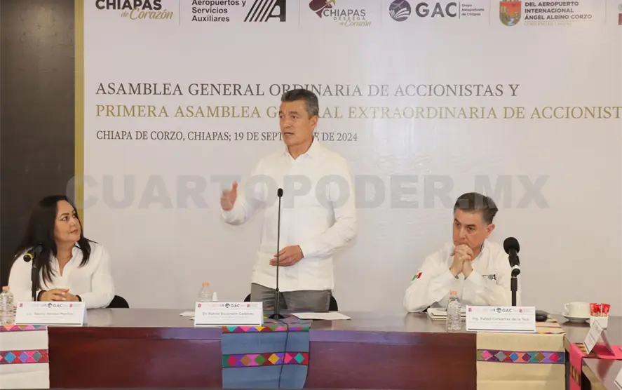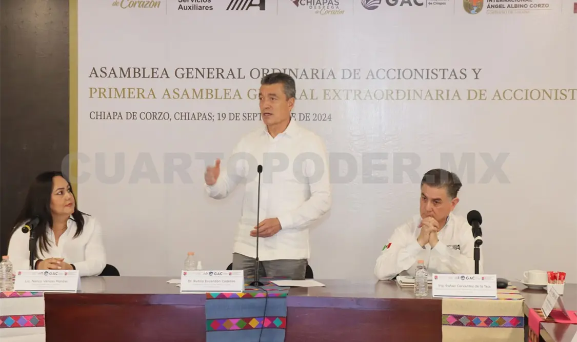 Durante la Asamblea General Ordinaria de Accionistas de la Sociedad Operadora del Aeropuerto Internacional Ángel Albino Corzo, el gobernador Rutilio Escandón Cadenas celebró las buenas noticias sobre el crecimiento e ingresos de esta terminal aérea, ya que, dijo, es un reflejo del trabajo que se ha hecho para fortalecer su infraestructura.