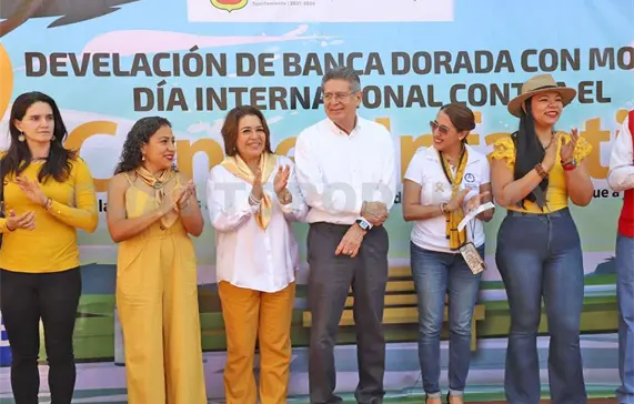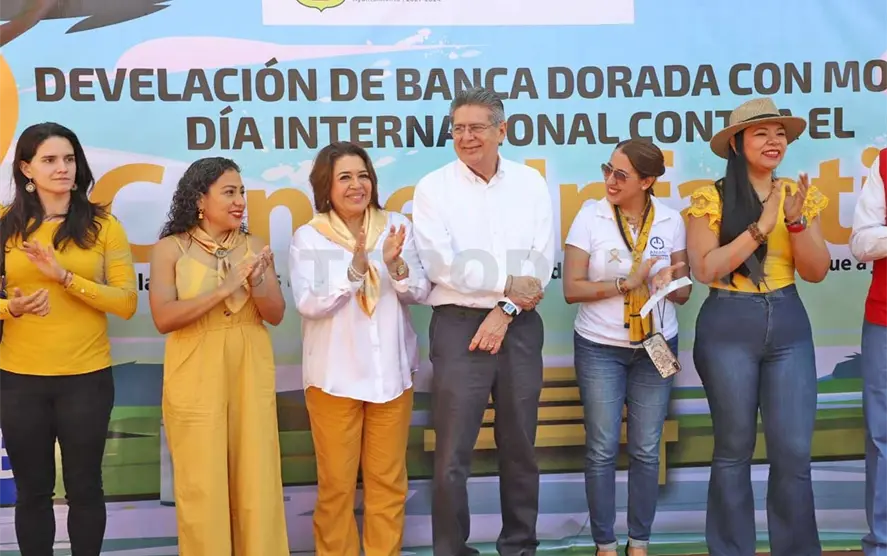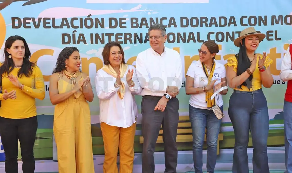 Con el objetivo de contribuir en la concientización, prevención, detección y tratamiento oportuno del cáncer infantil, el presidente municipal, Carlos Morales Vázquez, develó la “Banca Dorada” en el Parque Recreativo y Deportivo “Caña Hueca”.