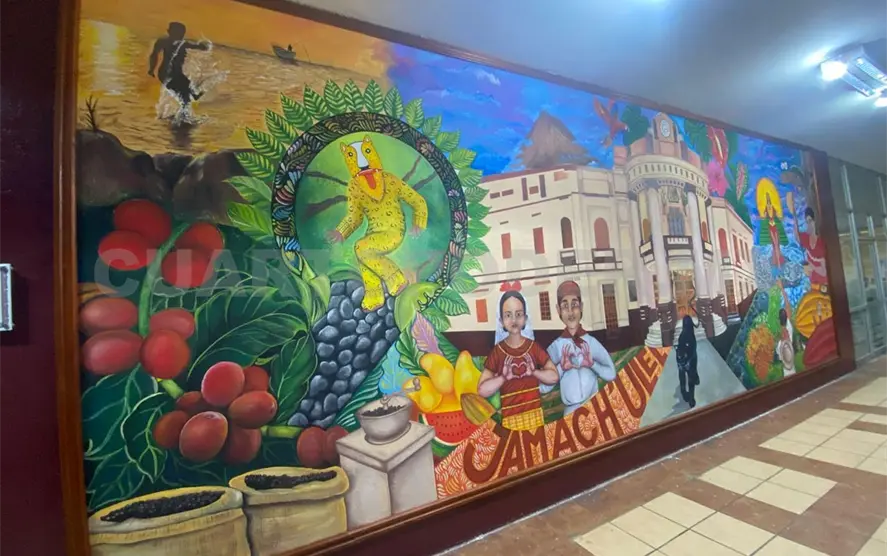 La zona arqueológica Izapa, el antiguo Palacio Municipal —hoy convertido en museo—, el café, cacao, rambután y mango, se pueden apreciar en el mural elaborado por los artistas locales, Arleth Zavala y Carlos Maldonado.